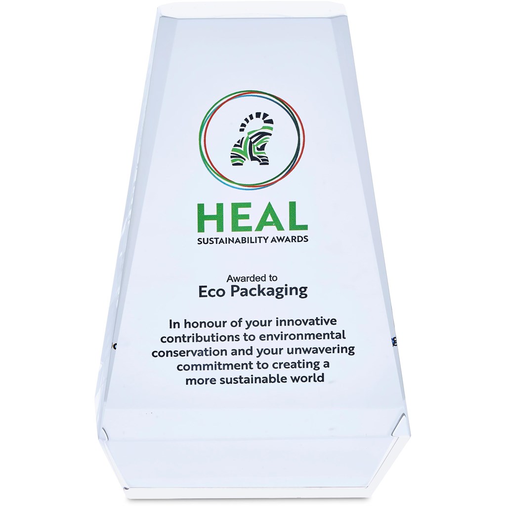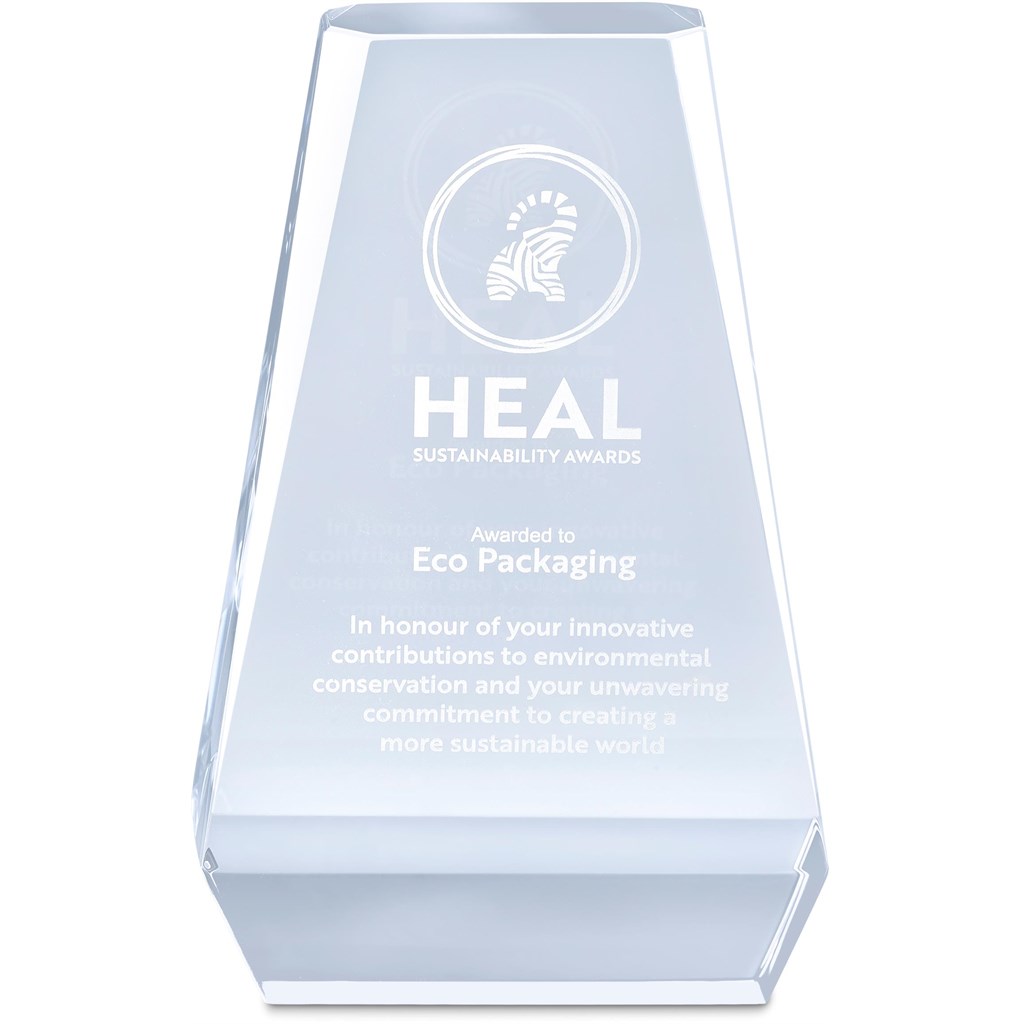 An optical glass award with a large platform for a full colour digital print. Presented in an elegant box with a padded satin lining inner.