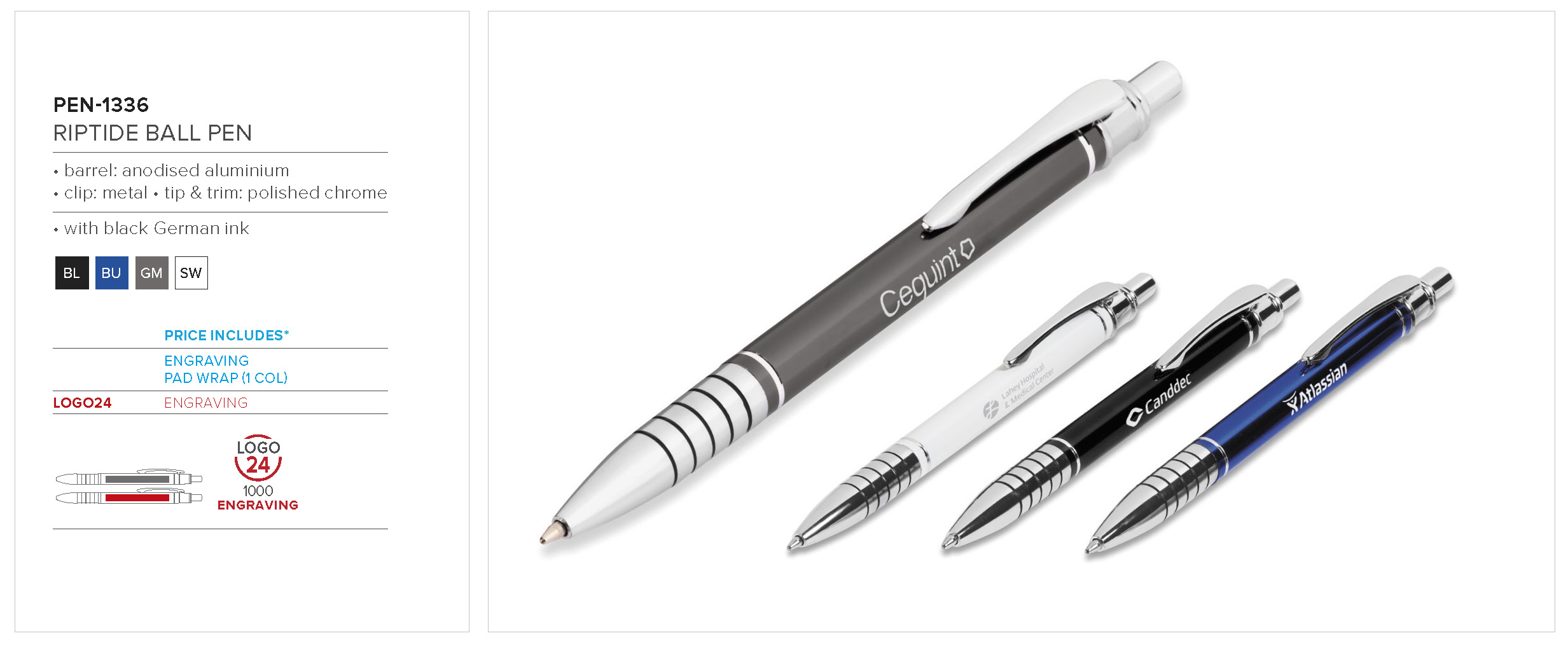 An elegant executive pen that is sure to be appreciated by its recipient. Available in 4 colours. • barrel: anodised aluminium• clip: metal • tip & trim: polished chrome • with black German ink