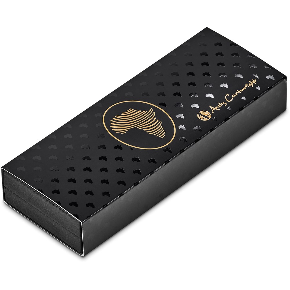 This beautiful writing instrument exudes African elegance and flair from South African designer, Andy Cartwright. The upper barrel has a shiny gold layer beneath the black coating, so that laser engraving reveals a colour and effect to match the gold trims and accents of this ball pen.