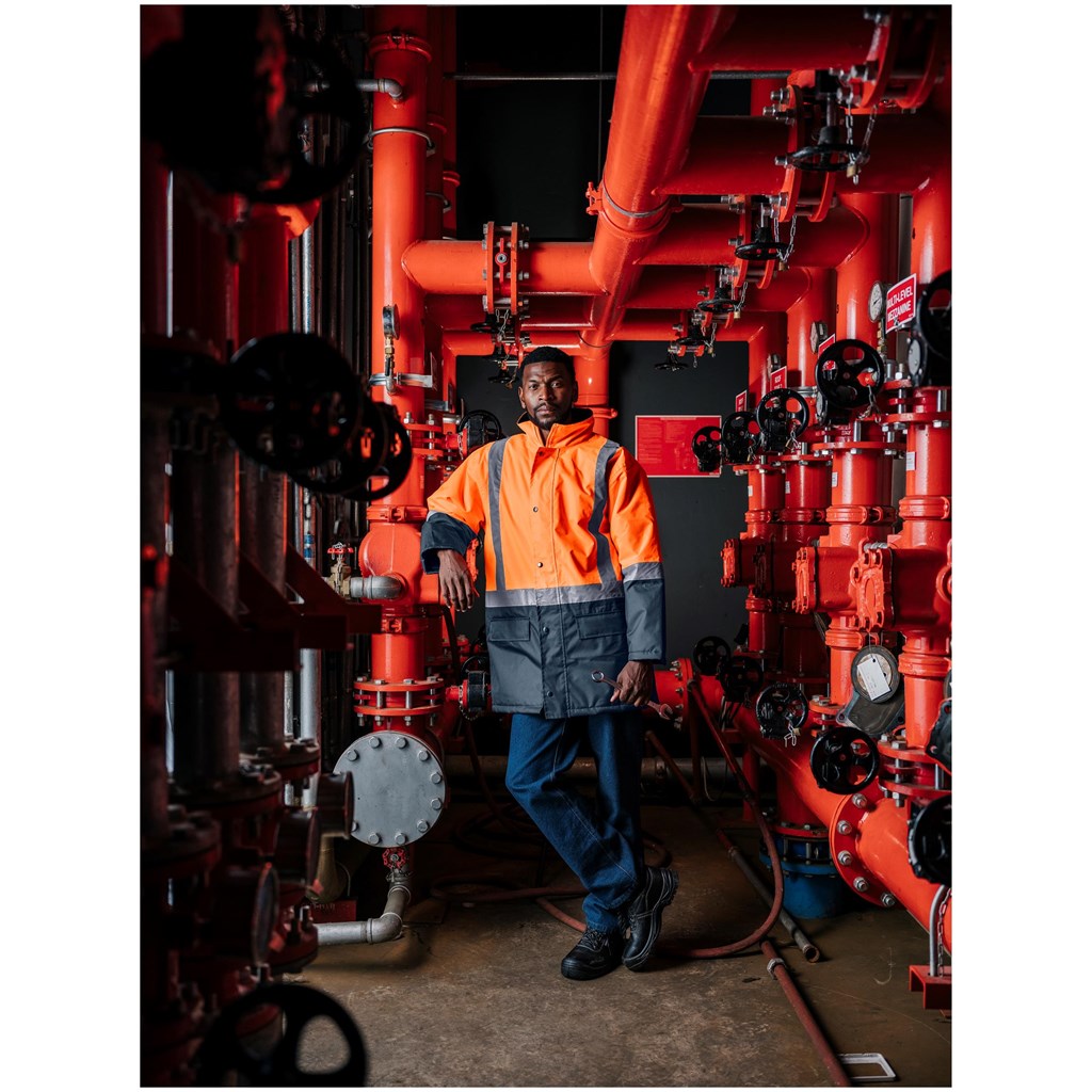 two-tone jacket with silver 50mm reflective tape detail • concealed zip features storm flap with press stud closure