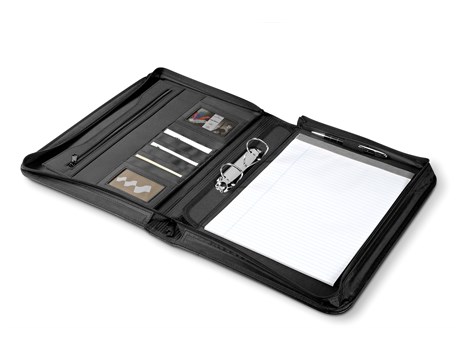 Made from a smooth black PU, with black stitching design, this zip-around folder features a metal plate for laser engraving of your logo.