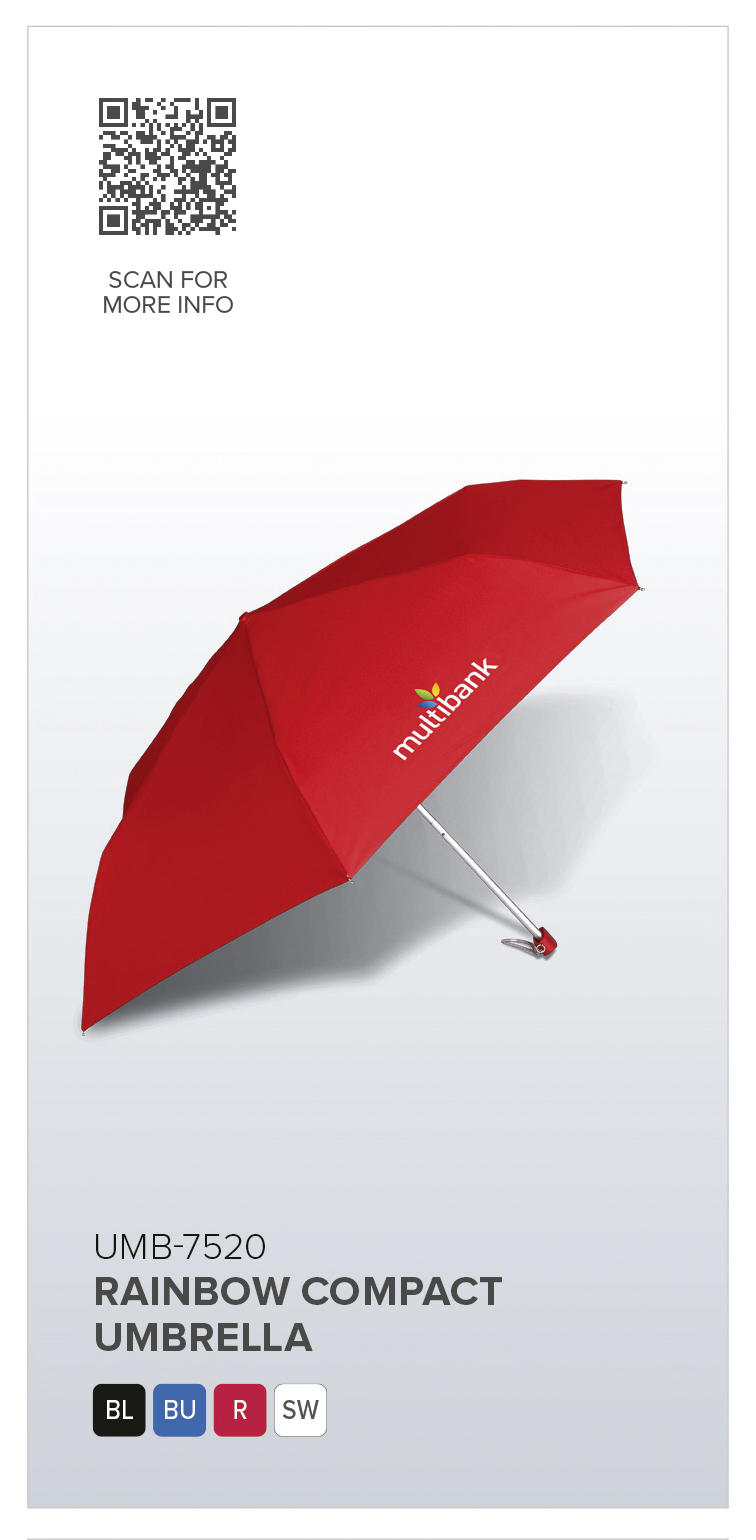 An affordable quality compact umbrella available in 9 bright colours. Folds up making it easy to store away or travel with. Features: 6 panels: aluminium shaft: colour co-ordinated handle and pouch.